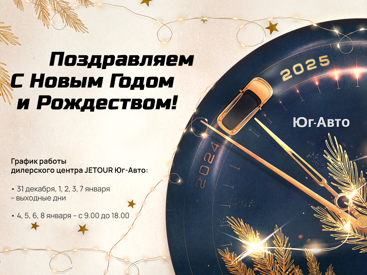 Команда JETOUR Юг-Авто поздравляет вас с наступающим Новым годом и Рождеством! Мы уверены, что этот год принесёт вам множество ярких моментов и успешных начинаний.